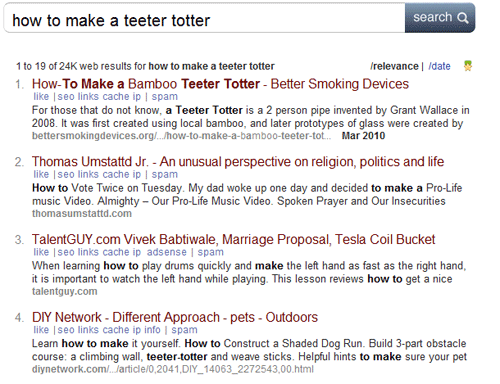 “How to tie a lure” (idea22 ranks with a page featuring a video), but has no external links. Some of the backfill sites are hanging on a thread.